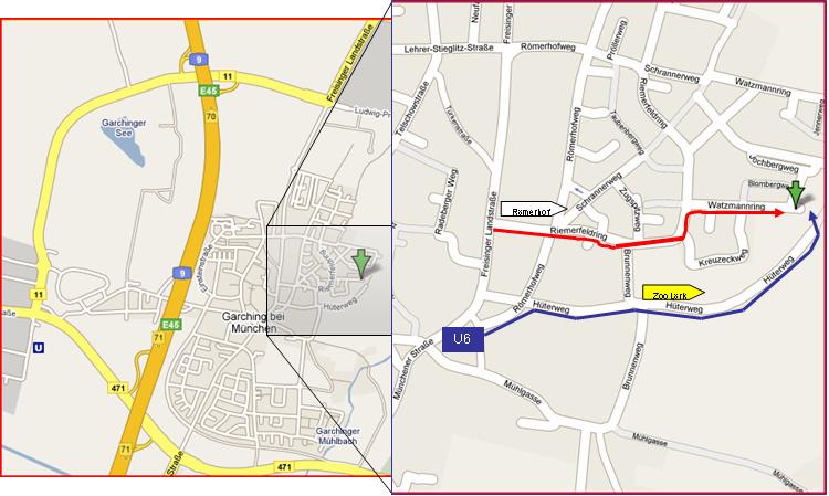 Mit den öffentlichen Verkehrsmitteln (U6):Vom Marienplatz geht es aus mit der U6 Richtung Garching-Forschungszentrum (ca. 30 Min. Fahrtzeit). Aussteigen an der Haltestelle Garching. Ausgang in Fahrtrichtung nehmen. Am Ausgang rechts halten um über den kleinen Weg auf den Römerhofweg zu gelangen und an der erste Kreuzung rechts in den Hüterweg abzubiegen und den immer weiter Richtung Zoo Lörk zu folgen. Am Ende, wo Zoo Lörk auf der rechten Seite liegt, ist auf der linken Seite eine Doppelhaushälfte mit einem Stelzenhaus im Garten. Das ist das Ziel. (ca. 800 Meter Wegstrecke)
